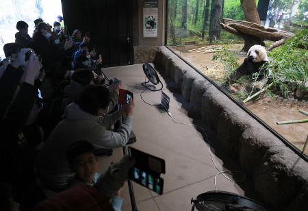 上野動物園の双子のジャイアントパンダ、シャオシャオとレイレイの中国返還が発表されて初の開園日となった16日、2頭を一目見ようと多くの人が訪れ、「寂しい」などと嘆きつつ、愛くるしい姿を写真に収めていた。 【時事通信社】